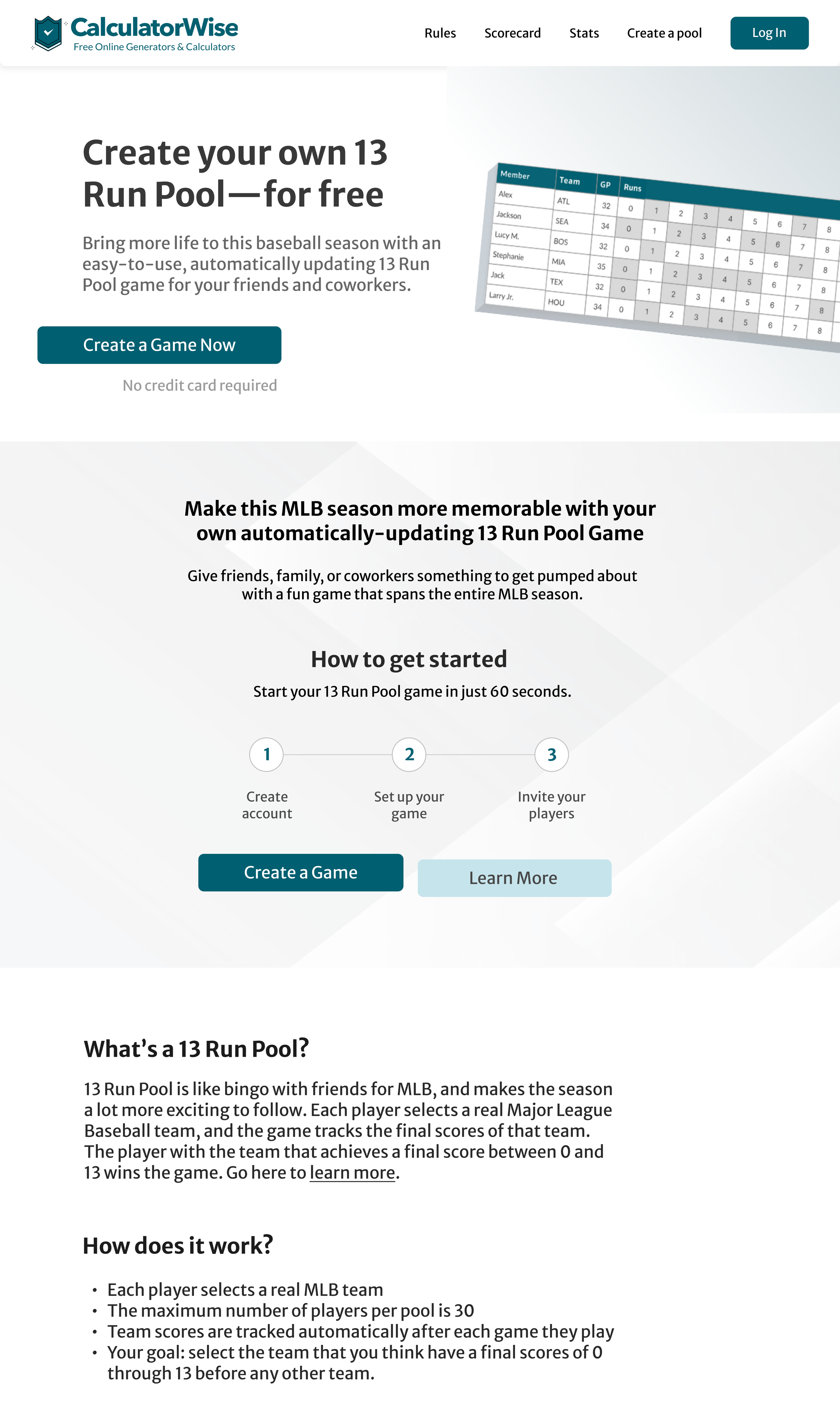 13 Run Pool serves as an extension to the well-established web application, CalculatorWise. This web app offers users an engaging online game tailored for sports enthusiasts, office pools, social gatherings, and family get-togethers.