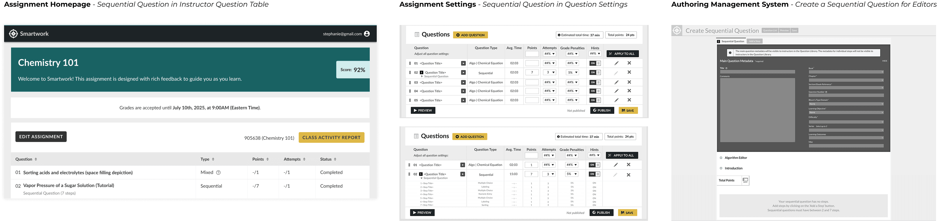 Sequential Questions is a question type developed for Smartwork, W.W. Norton's online learning assessment tool used by over one million college students and instructors. The question type allows students to work through complex, multi-step problems sequentially, where each step builds on the previous one—functionality that didn't exist in Smartwork or any competitor platform at the time.