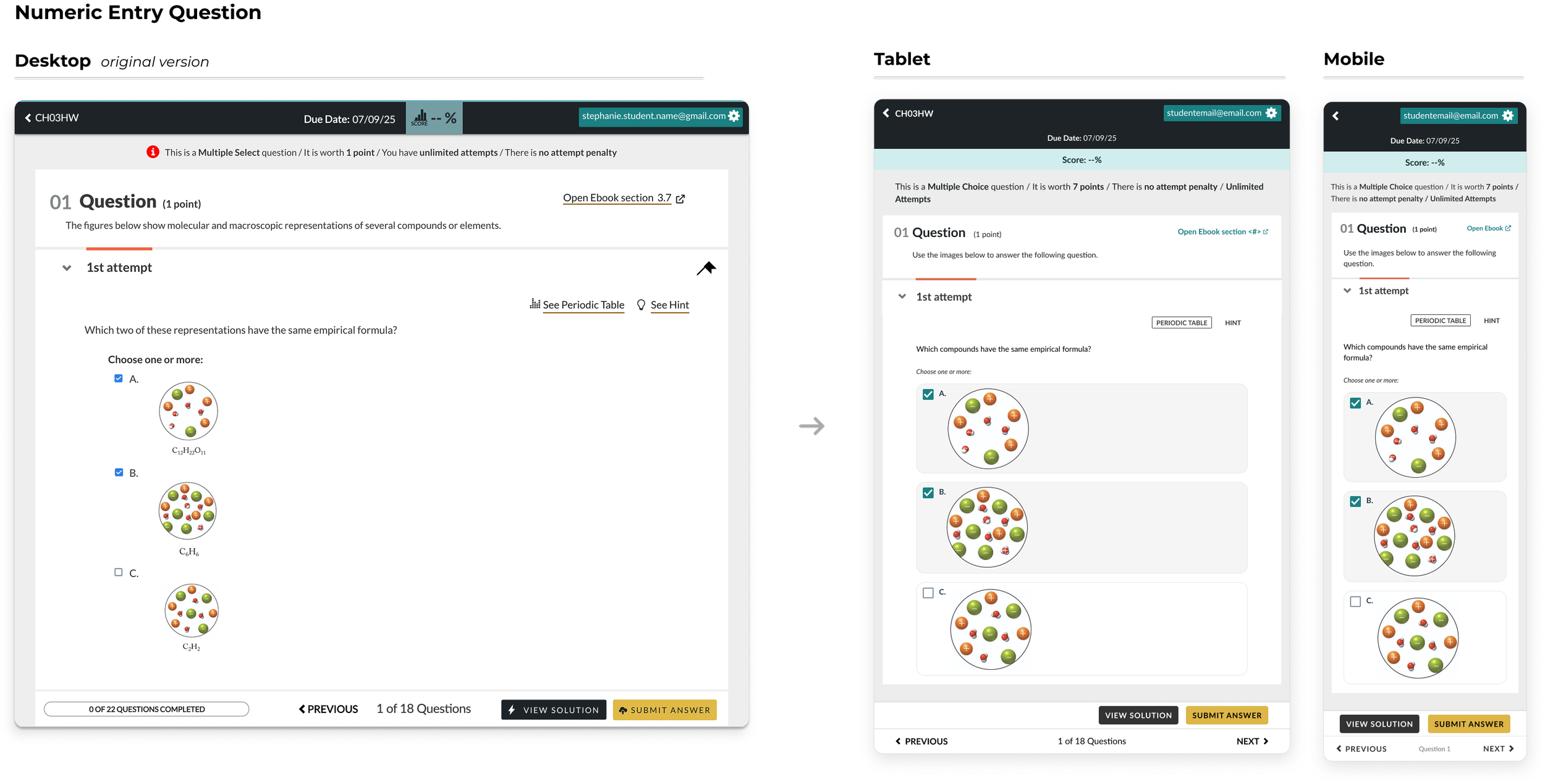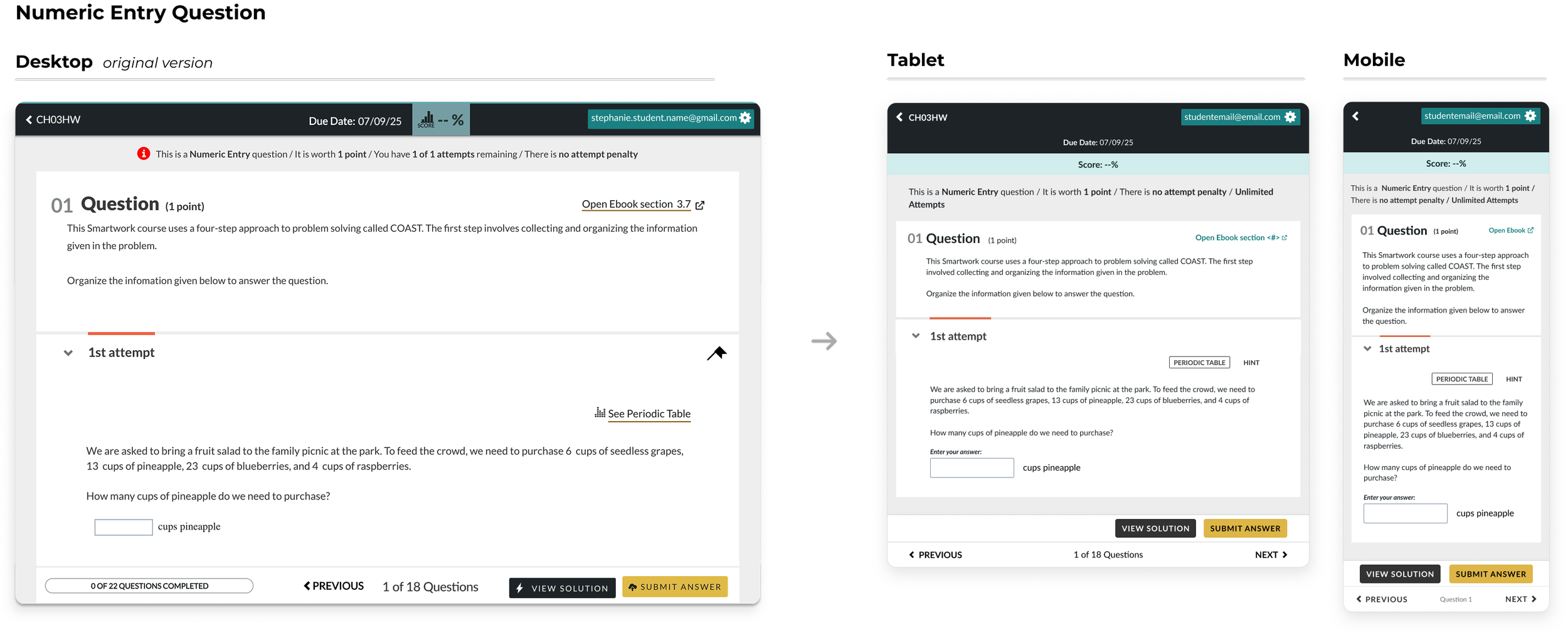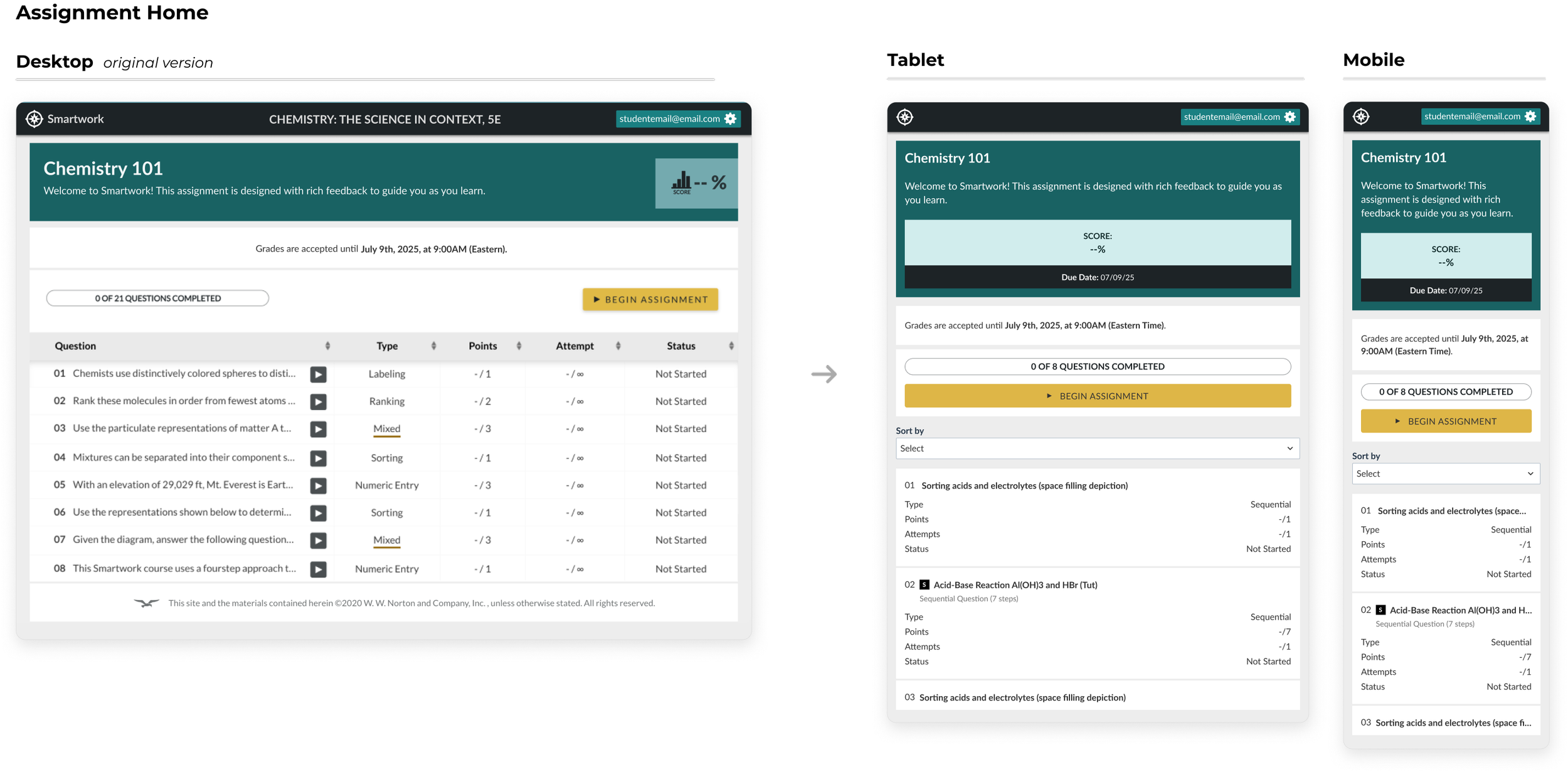 The current Smartwork desktop experience, relied upon by over 1million students and instructors, was the foundation of our responsive designs. Our goal was to preserve Smartworks’ core functionality and familiar workflows while allowing it to span across multiple devices.