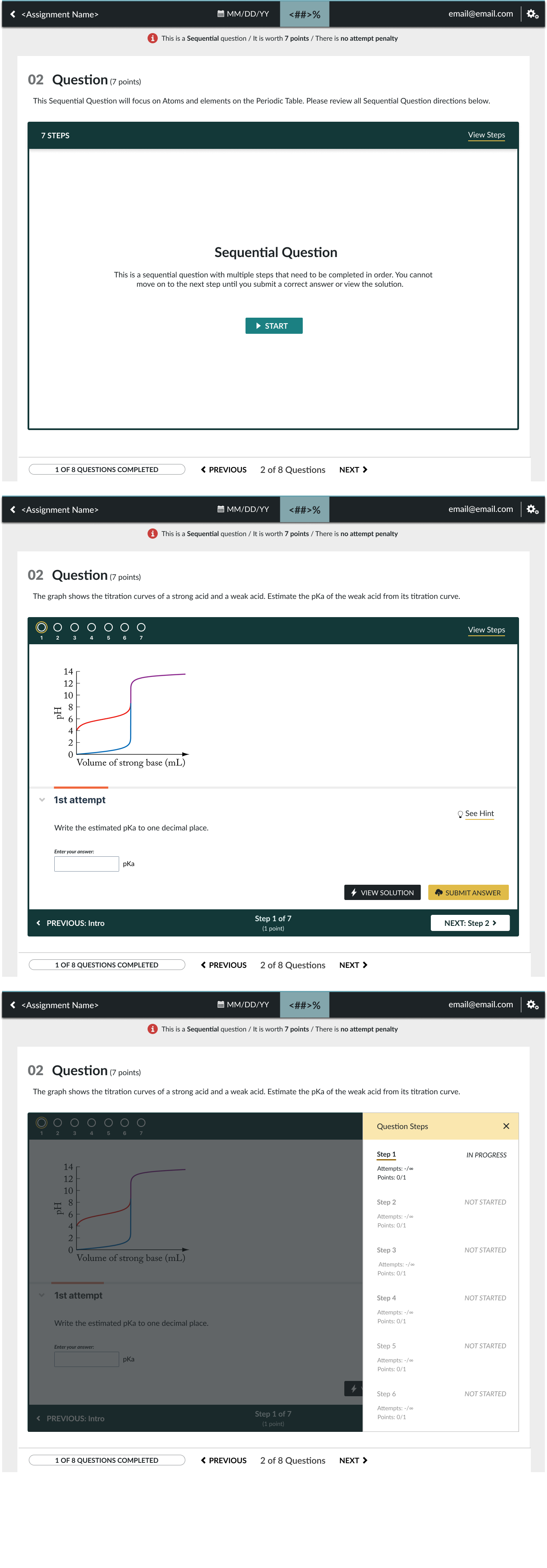 To solve this, I focused on providing students with a visually clear design to distinguish a Sequential Question from other regular Smartwork questions. I began by designing a clear Start Page that explained the new question type and how to navigate it. I then added a prominent stepper at the top of the question and a question steps sidebar to communicate the total number of steps and the student's current progress. For step navigation, I introduced a new bottom bar with a clear border around the step content to make the multi-step nature of the question visually apparent.