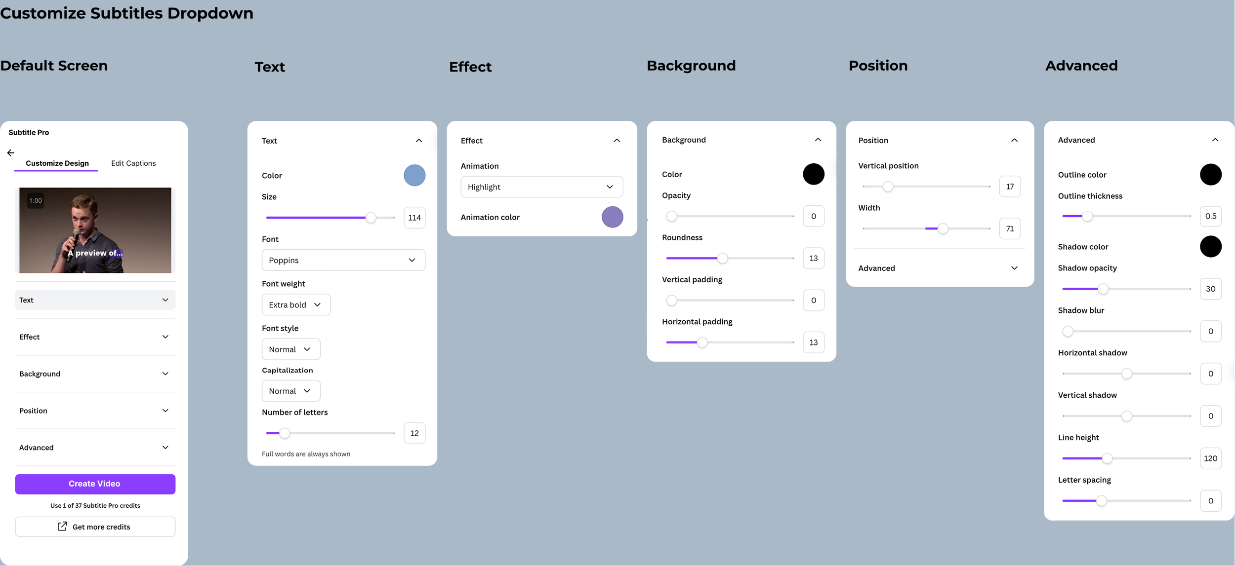 This application needed to offer the most extensive customization on the market, allowing users to effortlessly personalize colors, fonts, and animations with a live preview, as well as seamlessly edit their transcriptions. The core challenge was achieving this complex functionality while also minimizing the number of steps and screens required to complete the task, all while integrating with Canva’s design system.