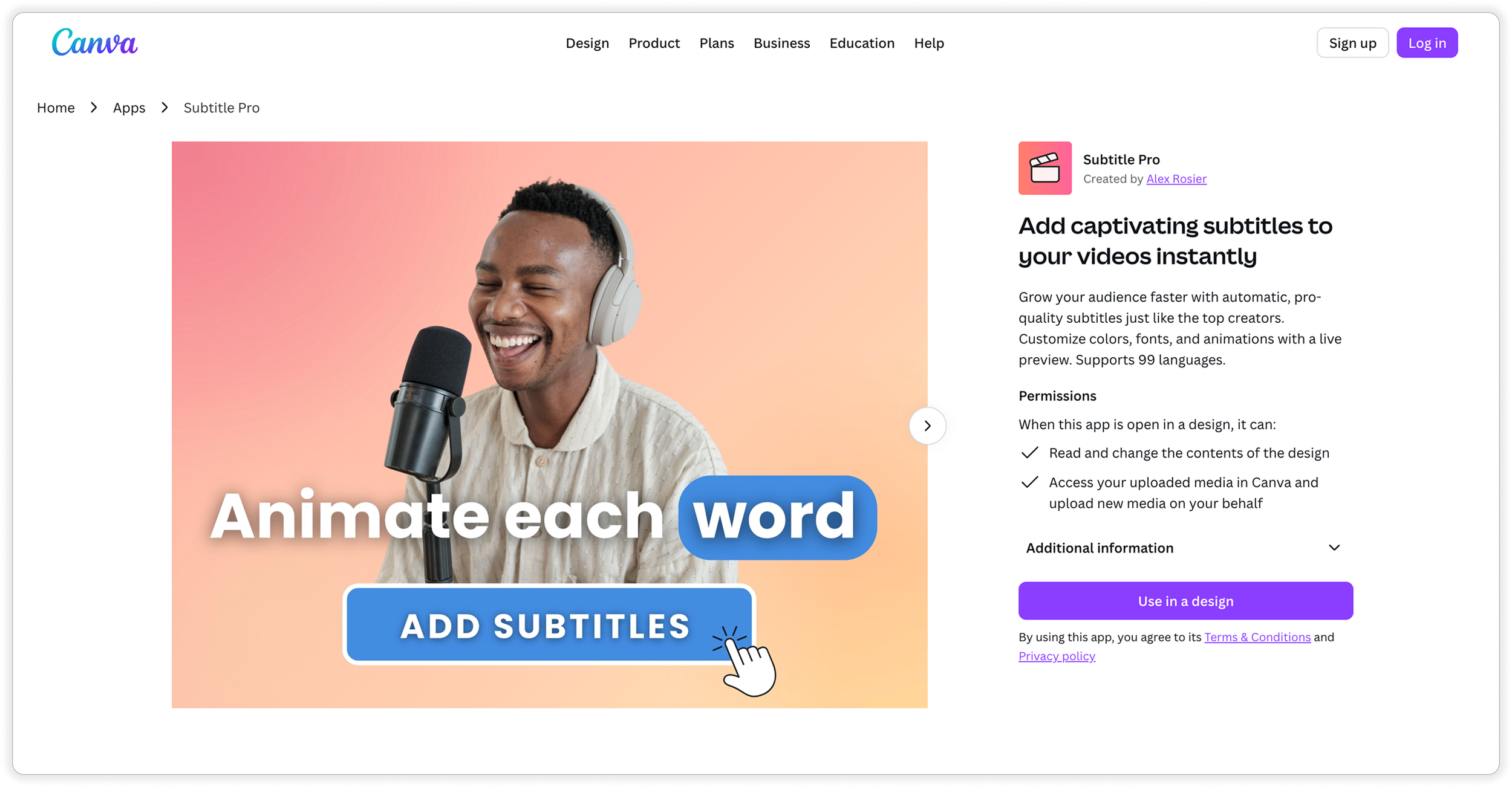 This application was built to bridge that gap, streamlining the subtitling process so users could effortlessly add captions directly to their Canva projects. It offers a wide range of options for extensive customization, allowing users to personalize colors, fonts, and animations with a live preview. With the use of AI, the app can support over 99 languages, making content accessible to a global audience.