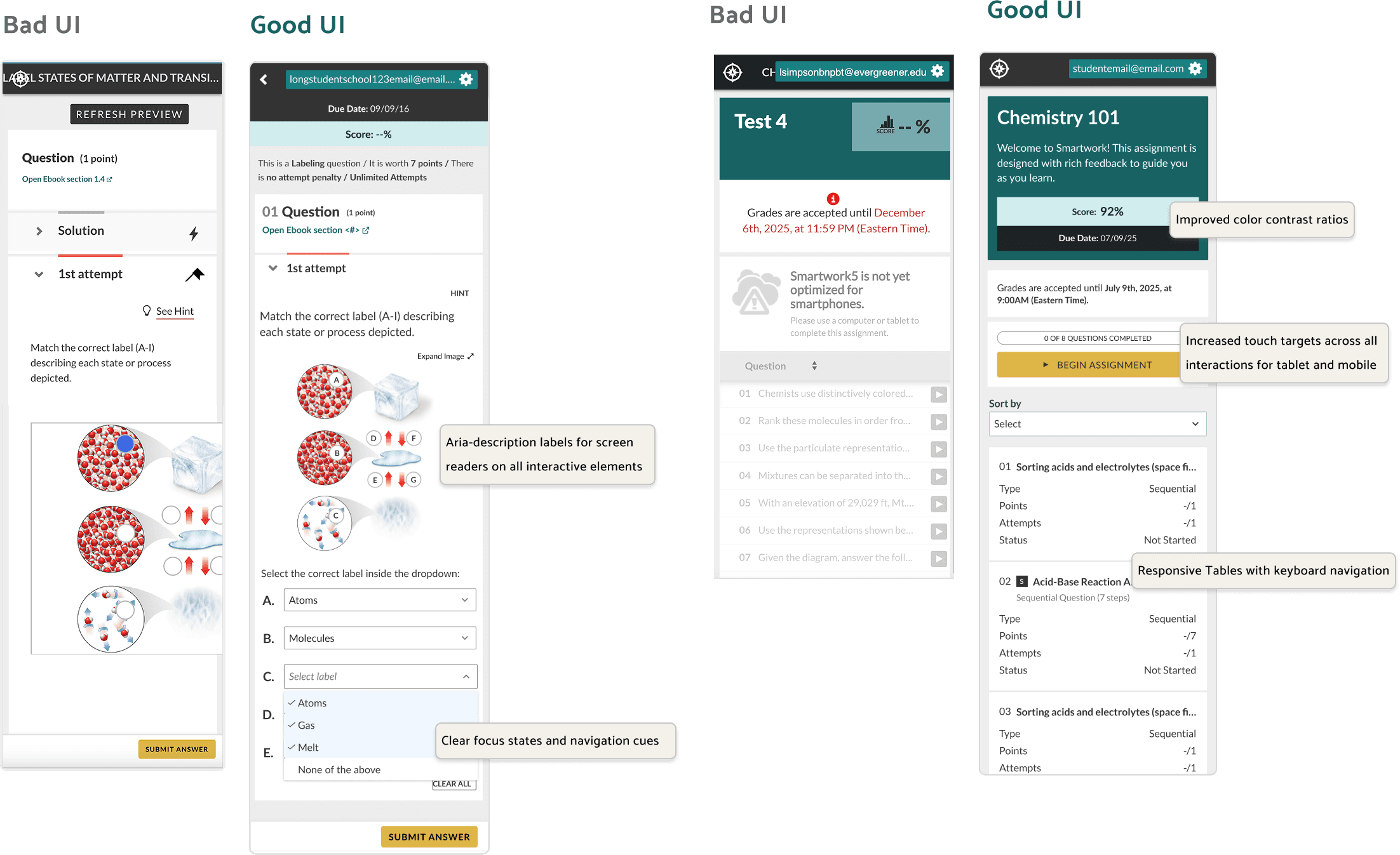 All Smartwork questions needed to be AAA WCAG compliant. They failed our … They were not usable with screen readers and not functional on mobile.