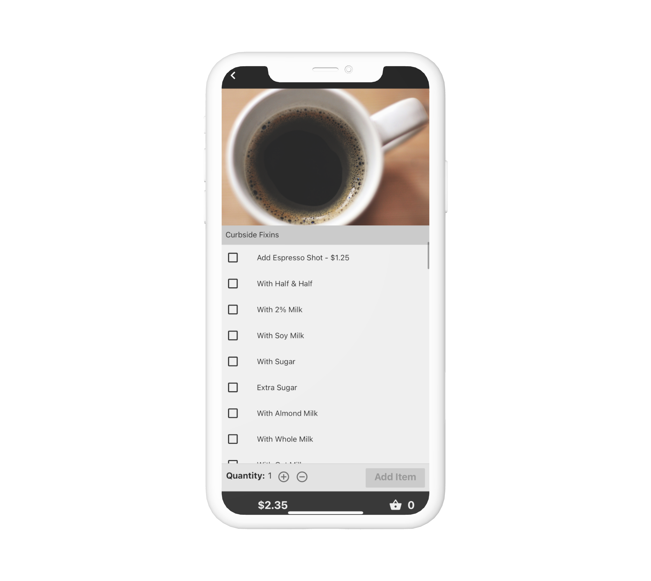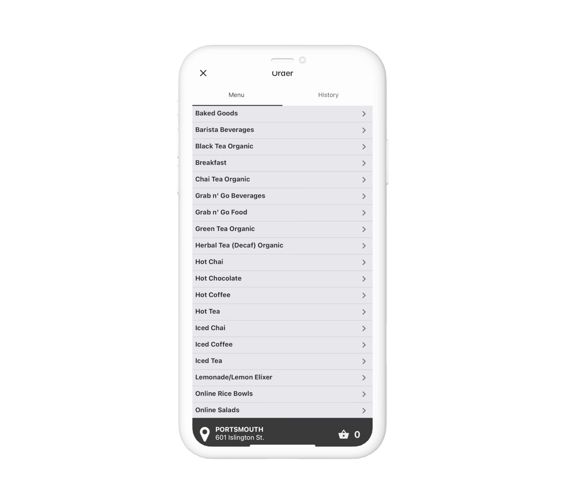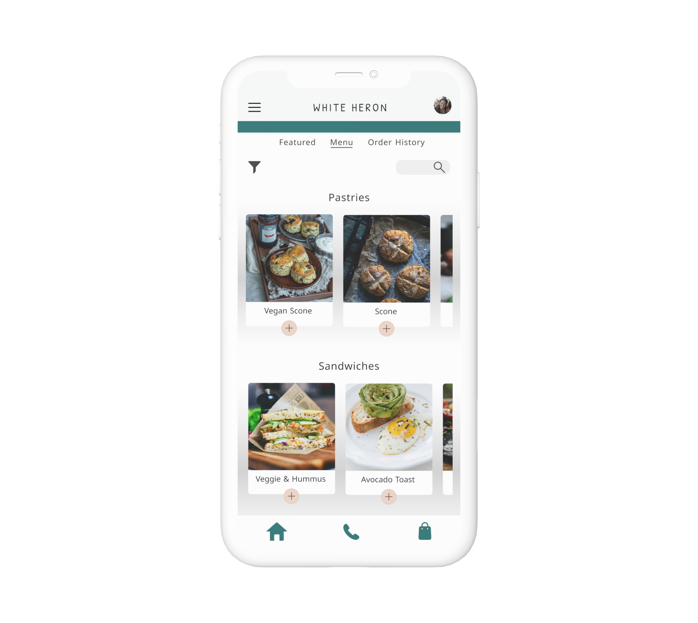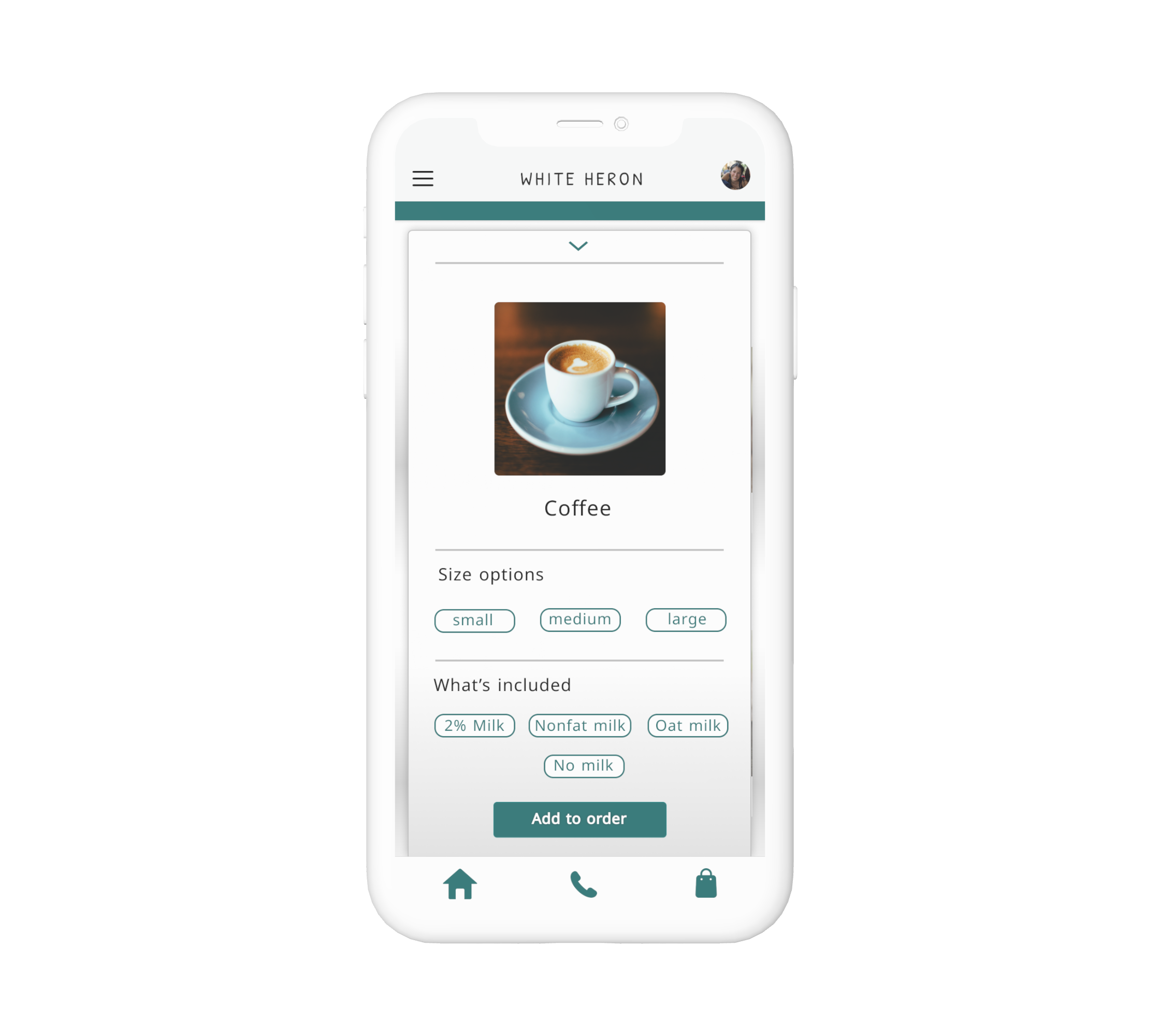 Create a smooth online ordering experience for White Heron, a prominent coffee shop in Portsmouth, NH. A mobile app with a focus on: